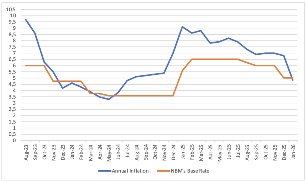În decembrie 2025, Banca Națională a Moldovei a redus rata de referință de la 6% la 5% anual, iar în februarie 2026 a confirmat această decizie, menținând rata la același nivel. Este evident că decizia a fost aprobată în așteptarea efectului măsurilor adoptate anterior.