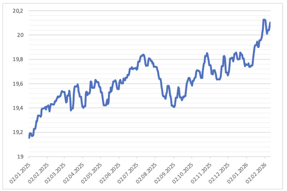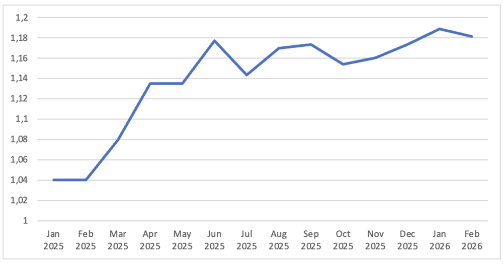 În consecință, dolarul se depreciază: dacă la 4 ianuarie 2025 raportul dintre dolarul american și euro era de 1,03, la 10 februarie 2026 era de 1,19.