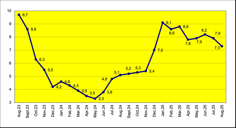 Dinamica inflației august 2023 - august 2025, în procente anual