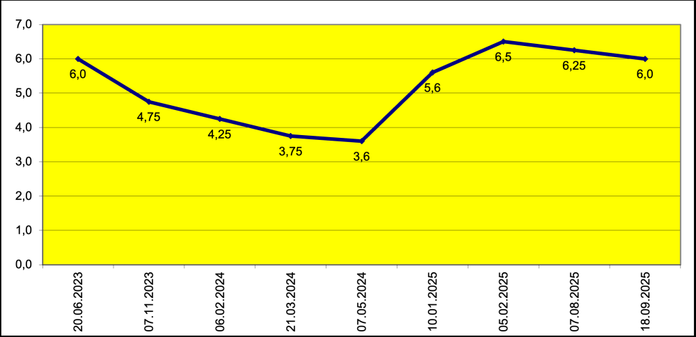 La sfârșitul lunii ianuarie, inflația anuală a crescut la 9,1% pe an, iar la 5 februarie, BNM a ridicat rata de bază la 6,5%. Din februarie până în august 2025, inflația „oscila” în sus și în jos (statisticile pe mai mulți ani arată că astfel de fluctuații bruște sunt un fenomen destul de neobișnuit pentru economia moldovenească). În iulie, rata inflației a fost de 7,9% pe an, iar la începutul lunii august, BNM a relaxat politica monetară, reducând rata de la 6,5% la 6,25%. În ciuda relaxării, în august inflația a scăzut la 7,3% anual. Banca Națională continuă politica sa și, la 18 septembrie 2025, reduce rata de bază la 6% pe an.