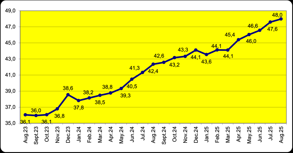 În ultimii doi ani se observă o creștere a volumului creditelor noi acordate. În august 2023 – 3,23 miliarde de lei; în august 2024 – 4,28 miliarde de lei; în august 2025 – 4,75 miliarde de lei. Recordul pentru această perioadă în ceea ce privește acordarea de noi credite a fost înregistrat în decembrie 2024 – 6,12 miliarde de lei. Adică, în țară circulă mai mulți bani din cauza creșterii volumului creditelor, iar BNM, prin reducerea ratei de bază, stimulează acest proces.