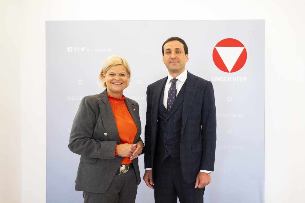 Klaudia Tanner, ministrul Apărării al Austriei și Dmitri Torner, președintele Asociației Sporturilor de Iarnă din Republica Moldova, la întrevederea de la Ministerul Apărării al Austriei. Viena, 10 aprilie 2024