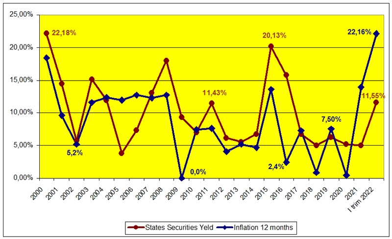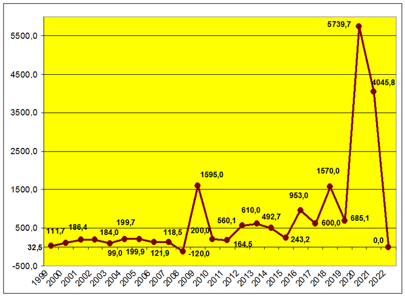 Despite the fact that many believe that the SS market is a "pyramid" (the volume of securities in circulation increases from year to year, and it is more difficult for the Ministry of Finance to service them), the economy has developed one way or another. The situation was critical in 2009 (parliamentary elections and change of political course), but even more critical in 2000 and 2021. This is what the last 20 years look like…