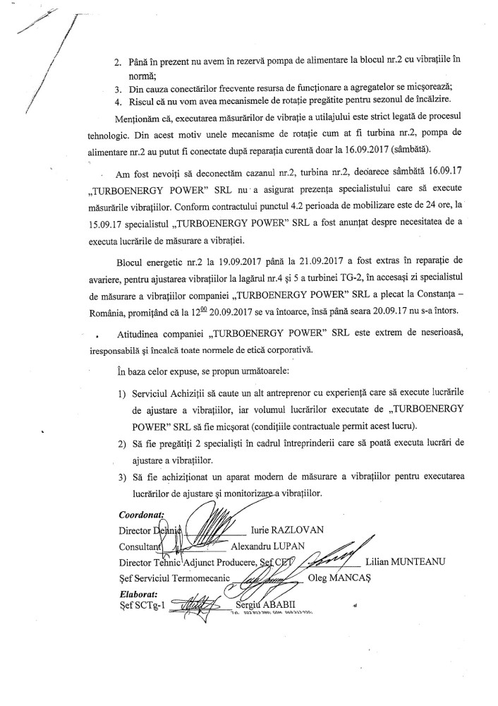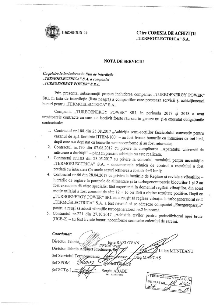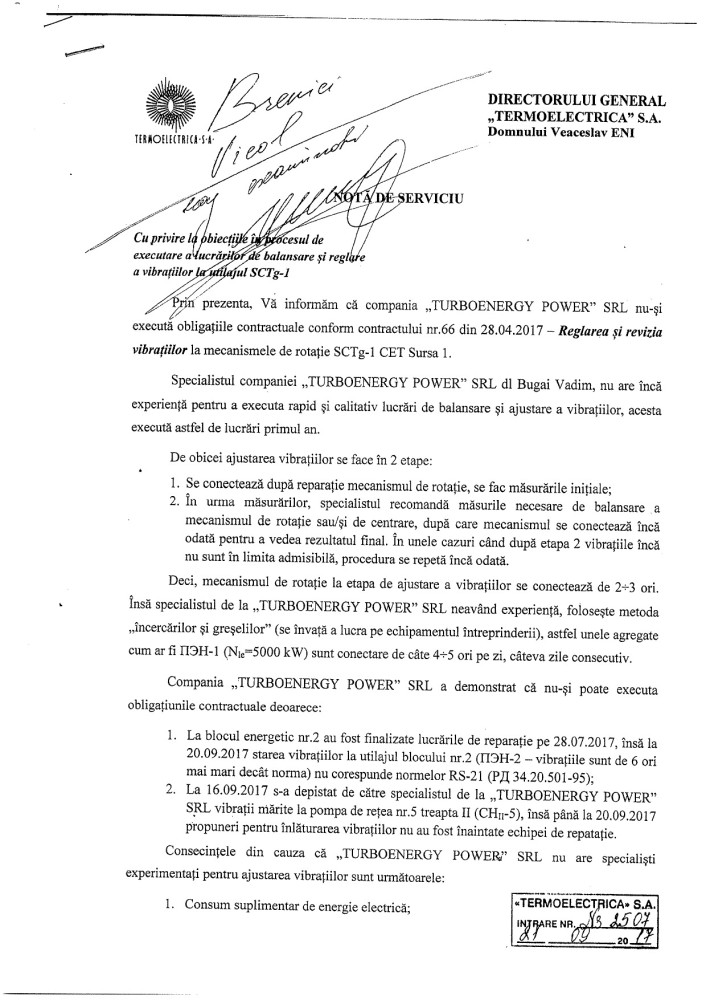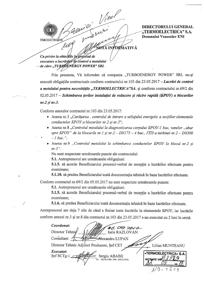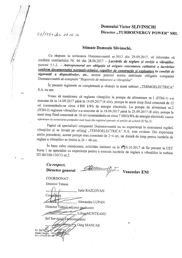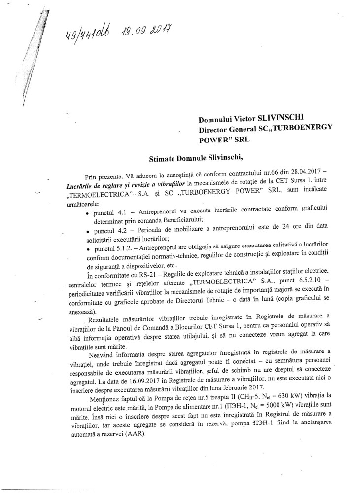 “Vă prezentăm copia unor documente (autenticitatea acestora poate fi verificată, mizăm să se sesizeze autoritățile centrale și instituțiile specializate ale statului), care demonstrează problemele create de compania “TurboEnergy Power” SRL urmare a lucrărilor defectuoase, necalitative și cu întârziere, efectuate la “Termoelectrica” SA în perioada 2017-2018. Din cauza problemelor serioase apărute la “Termoelectrica”, rezultat al nerespectării obligațiunilor contractuale de către “TurboEnergy Power” SRL, au fost cauzate pagube financiare întreprinderii, iar în consecință, compania românească (condusă de moldoveanul Victor Slivinschi), a fost inclusă în LISTA NEAGRĂ a “Termoelectrica”, se spune în mail.