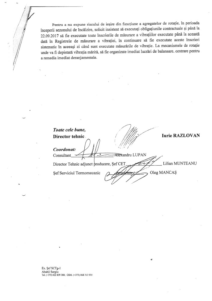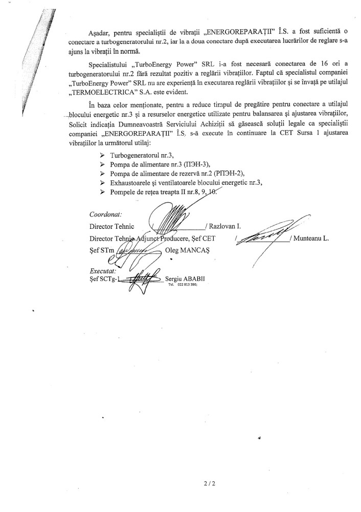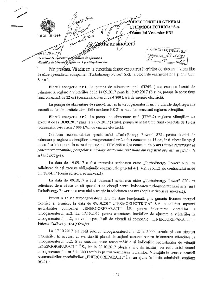 “Expediem aceste documente în contextul informațiile recente apărute în presă despre insistența companiei “TurboEnergy Power” să participe la modernizarea blocurilor 2 și 3 a „Termoelectrica”. Personalul întreprinderii “Termoelectrica” știe foarte bine că la blocul 2, unde este nevoie de o nouă turbină, compania “TurboEnergy Power” nu poate executa integral lucrările,, se spune în mailul parvenit la redacție.