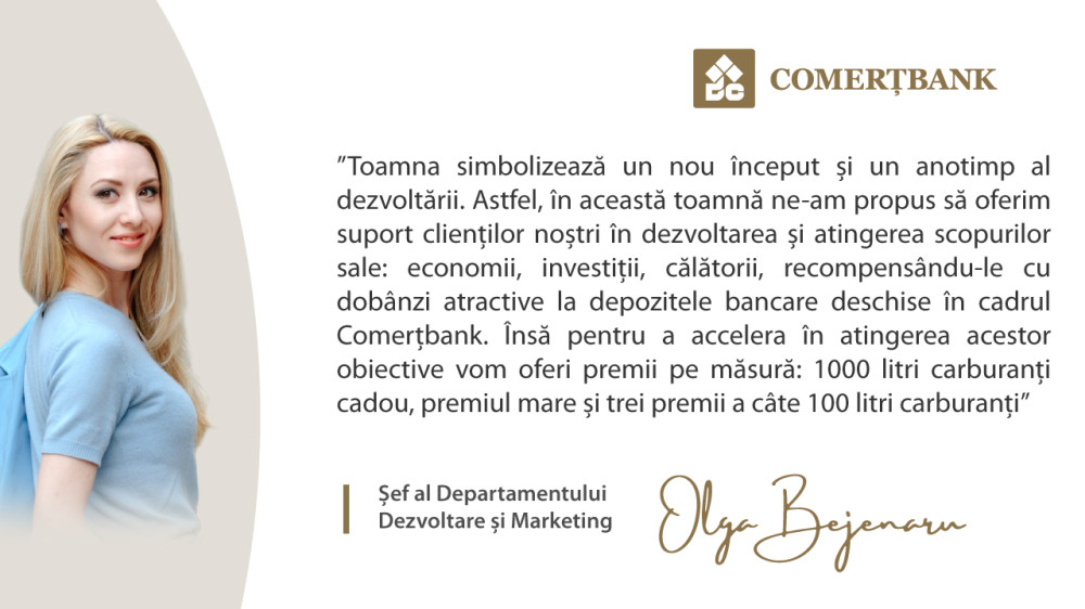 “Toamna simbolizează un nou început și un anotimp al dezvoltării. Astfel, în această toamnă ne-am propus să oferim suport clienților noștri în dezvoltarea și atingerea scopurilor sale: economii, investiții, călătorii, recompensându-le cu dobânzi atractive la depozitele bancare deschise în cadrul Comerțbank. Însă pentru a accelera în atingerea acestor obiective vom oferi premii pe măsură: 1000 litri carburanți cadou, premiul mare și trei premii a câte 100 litri carburanți”, a menționat: Olga Bejenaru, Șef al Departamentului Dezvoltare și Marketing, al B.C.”Comerțbank”S.A.