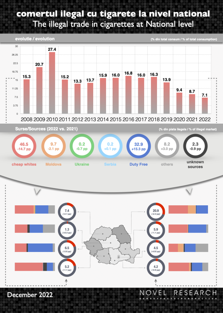 „În luna noiembrie, piața neagră a scăzut ușor la nivel național cu 0,3 p.p. față de septembrie. În majoritatea regiunilor țării, nivelul contrabandei se menține constant. Cele mai mari scăderi se înregistrează în vest, cu 3,6 p.p. până la 2,7% și în nord est, de 3,4 p.p. până la 19%, această din urmă regiune continuând să fie cea mai afectată de comerțul ilegal cu țigarete. Din punct de vedere al provenienței produselor de pe piața neagră, categoria Duty Free deține cea mai mare pondere în noiembrie, de 38,6%%, cu un avans de 0,9 p.p. față de septembrie. „Cheap Whites” se află în scădere semnificativă cu 7 p.p. până la 33%, Moldova este în creștere cu 9,4 p.p. până la 14,6%, iar Ucraina și Serbia se situează la nivel relativ constant. Cu toate acestea, pe ansamblul anului 2022, cea mai mare cotă pe piața neagră o dețin cheap whites (46,5%), iar media anuală a ponderii produselor provenite din Moldova este în scădere cu 2,1 p.p. până la 9,7%”, a declarat Marian Marcu, Director General Novel Research.