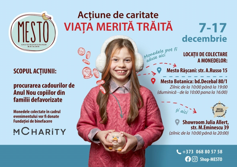„Viața merită trăită” - cel mai preferat și așteptat eveniment a proiectului MESTO: este disponibil pentru toată lumea, indiferent de vârstă, statut și venit. Toți cei care pot împărți cel puțin o monedă devin parte din această magie. În cadrul celor trei ediții anterioare ale acestui eveniment caritabil, am strâns aproape 270 de mii de lei. Ceia ce ne-a permis să îndeplinim cele mai profunde dorințe ale copiilor bolnavi de cancer, precum și să cumpărăm o casă rurală pentru o familie cu o mamă şi trei copii. Anul acesta ne propunem să aducem bucurie copiilor din familii defavorizate, unde nu există posibilitatea de a le îndeplini visele de Anul Nou. Este atât de important ca bucuriile sărbătorilor de iarnă și credința în miracole să fie disponibile tuturor copiilor.”