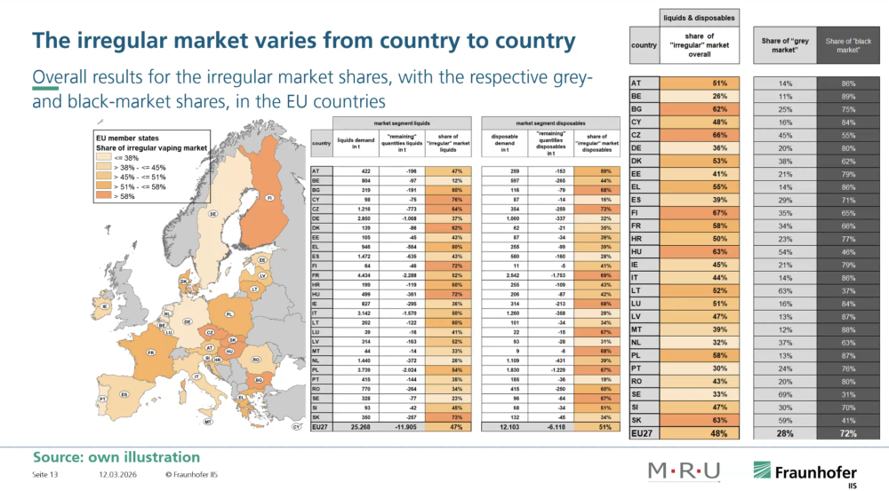 Ситуацию на рынке осложняют различия в регулировании внутри Европейского союза. В разных странах действуют разные ставки налогов на жидкости для вейпов и различные требования к продаже продукции. Такая фрагментация создает условия для параллельного импорта и трансграничной торговли. Дополнительным фактором роста серого рынка становится практически бесконтрольная электронная торговля.