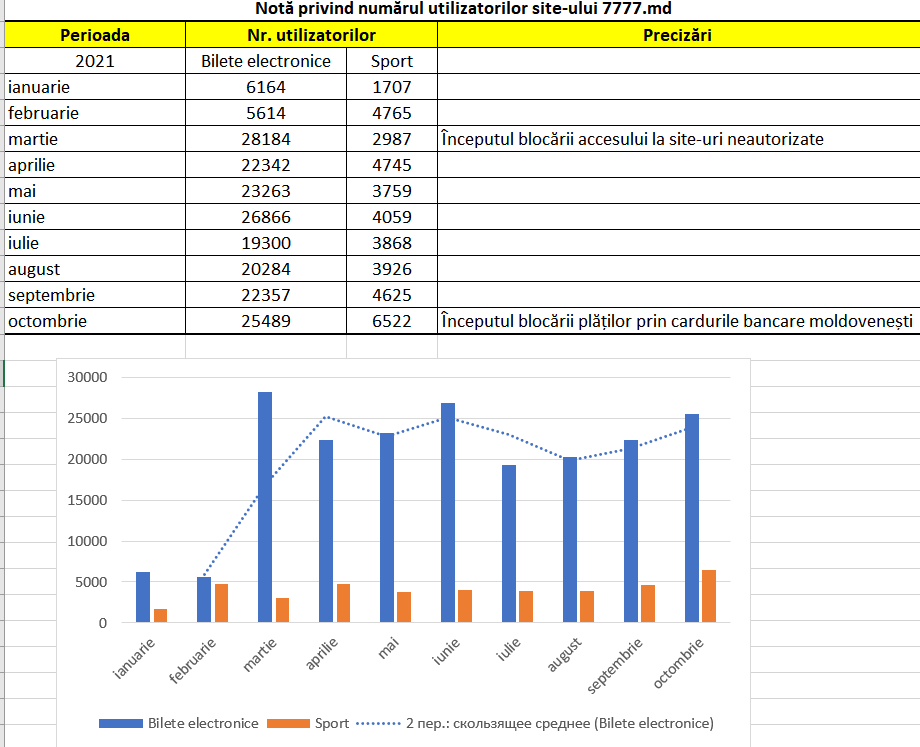 В 2021 году количество пользователей портала 7777.md увеличилось только тогда, когда власти начали блокировать доступ молдавских пользователей к иностранным игорным сайтам, которые не имеют разрешения на деятельность в нашей стране. Так, если в январе количество тех, кто делал спортивные ставки и выбирал онлайн-игры на единственном авторизованном сайте в Молдове, составляло менее 8 тысяч в месяц, то в марте наблюдается скачок до более 31 тысячи пользователей.