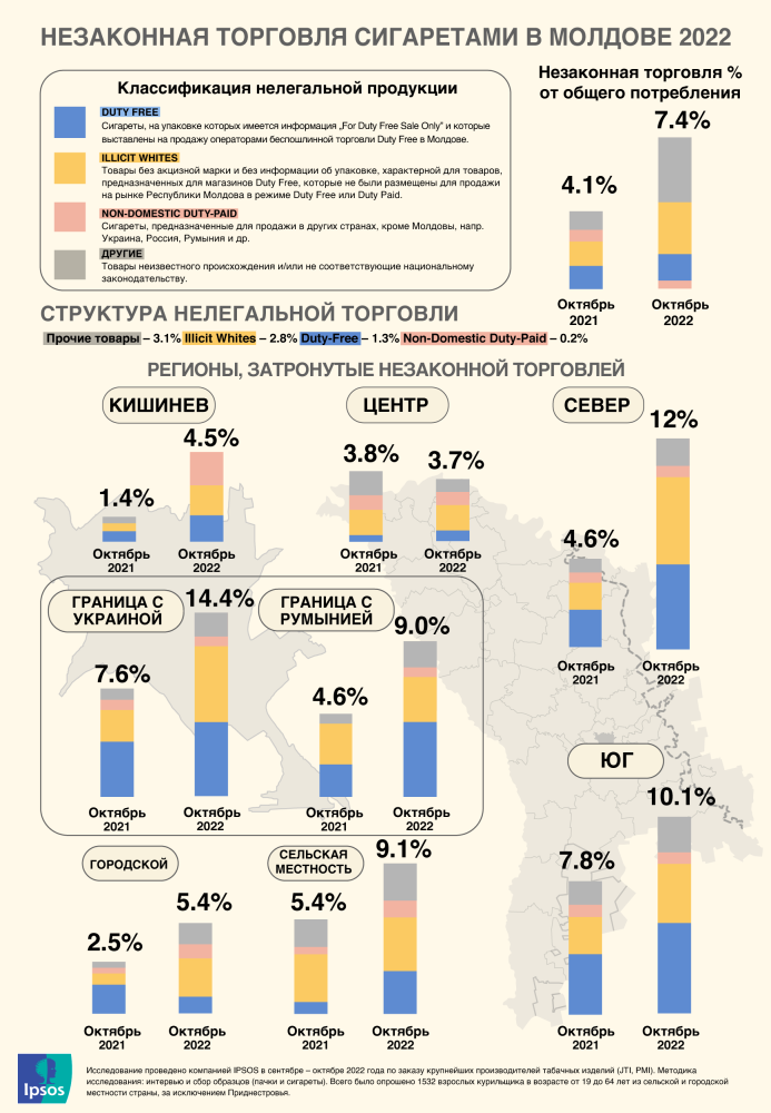 Результаты исследования также показывают удвоение незаконной торговли табачными изделиями в регионах, расположенных на границе с Украиной, с 7,6% до 14,4%, затронув населенные пункты Бричаны, Дондюшаны, Каушаны, Окница, Сороки и другие. Однако нелегальный сектор вырос и в северном регионе страны, причем довольно существенно - с 4,6% до 12%. Также с 4,6% до 9% увеличилась нелегальная торговля на границе с Румынией, в населенных пунктах Хынчешть, Ниспорень, Унгены, Единцы, Леова и др.