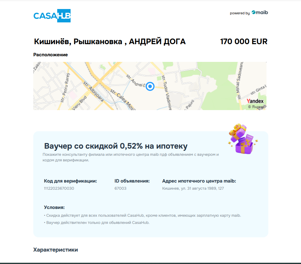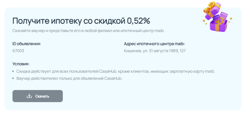 Предоставьте скаченный ваучер одному из консультантов ипотечного центра maib (ул. 31 августа 1989, 127, в здании maib park) или любого отделения банка и получите нашу скидку на ипотеку.