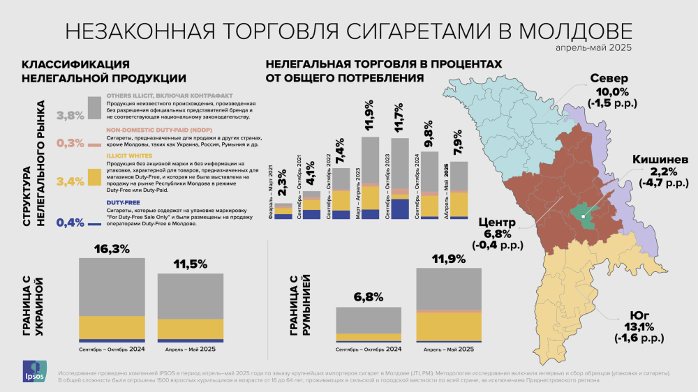 В период апрель - май 2025 года доля нелегальной торговли сигаретами в Республике Молдова составила 7,9%, снизившись на 1,9 процентных пункта по сравнению с сентябрем - октябрем 2024 года, согласно данным исследования, проведенного исследовательской компанией IPSOS. Это второй год, когда “чёрный рынок” табачных изделий демонстрирует спад. Ранее эксперты объясняли эту тенденцию сбалансированной и предсказуемой налоговой политикой, которая предусматривает поэтапное повышение акцизов в зависимости от доходов и покупательной способности населения.
