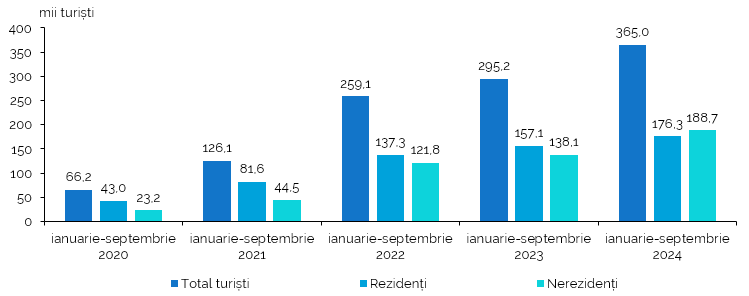 По предварительным прогнозам, в 2024 году экономический эффект будет существенно выше. Так, в январе-сентябре туристические агентства приняли 453 тыс. человек, что на 10,3% больше, чем за тот же период прошлого года. При этом въездной и внутренний туризм вырос на 11,3% и 14,3%, соответственно. Количество иностранных граждан, посетивших Молдову посредством турагентств увеличилось на 53,8% по сравнению с январем-сентябрем 2023 года, составив 51,1 тыс. посетителей.