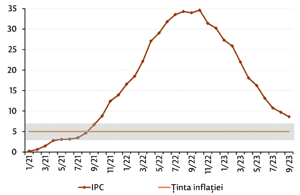 То есть на протяжении 22-х последовательных месяцев она непрерывно росла. Но, преодолев пик, за 12 месяцев следующих месяцев вернулась в заданный коридор. Вне коридора инфляция в Молдове была в период октябрь 2021 – октябрь 2023 г. Правда, и пик ее был достаточно высок.