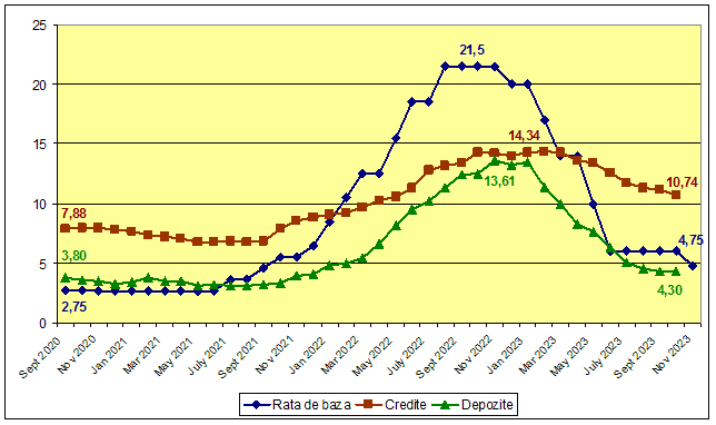 Как видим, с июня 2021 года ставки по депозитам уже не поспевает за базисной ставкой, а с января 2022 года до апреля 2023 – уже и кредитная «просела» под базисную. Но если ставки по депозитам практически повторяют динамику базисной ставки, кредиты ведут себя по-другому. Для того, чтобы не «убивать» своих заемщиков столь же резким повышением ставок по кредитам как и базисная, коммерческие банки позволили себе постепенный рост. Но, когда ставка НБМ с мая 2023 резко пошла на снижение, кредитные ставки не отличились такой же прыткостью, а снижаются намного медленнее.